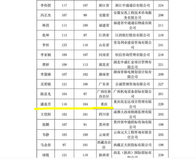 小編的視線順著網頁光標往下瀏覽,最終在附表第二頁找到了那個熟悉的名字——重慶欣宏達項目管理有限公司潘連芳,獲得首次初級招采人員測試重慶地區成績第一名。哪怕和全國各省份的狀元們放在一起,她的成績也毫不遜色。