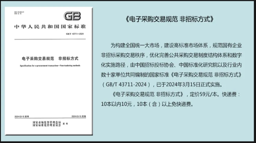 ![]() 據悉,《電子采購交易規范 非招標方式》(以下簡稱標準)是在國家發改委、國資委、住建部、國家能源局、審計署等多個部委的聯合指導下,經過中國招標投標協會和中國標準化研究院,以及多位行業專家的共同努力,歷時三年精心編制而成的。這一標準不僅填補了我國在國有企業采購制度規范領域的空白,更是首部適用于國有企業及其它企事業單位主體非招標項目的全國統一采購交易國家標準。