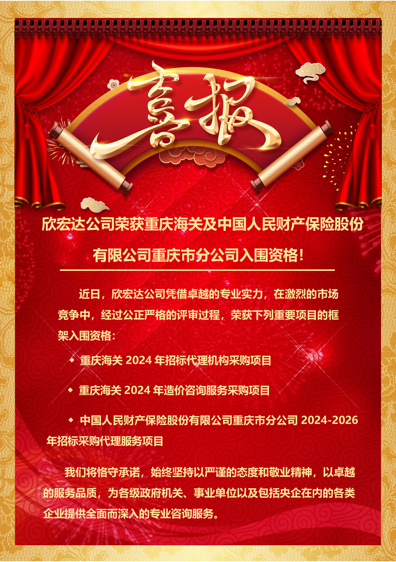 【喜訊】欣宏達公司榮獲重慶海關及中國人民財產保險股份有限公司重慶市分公司入圍資格!